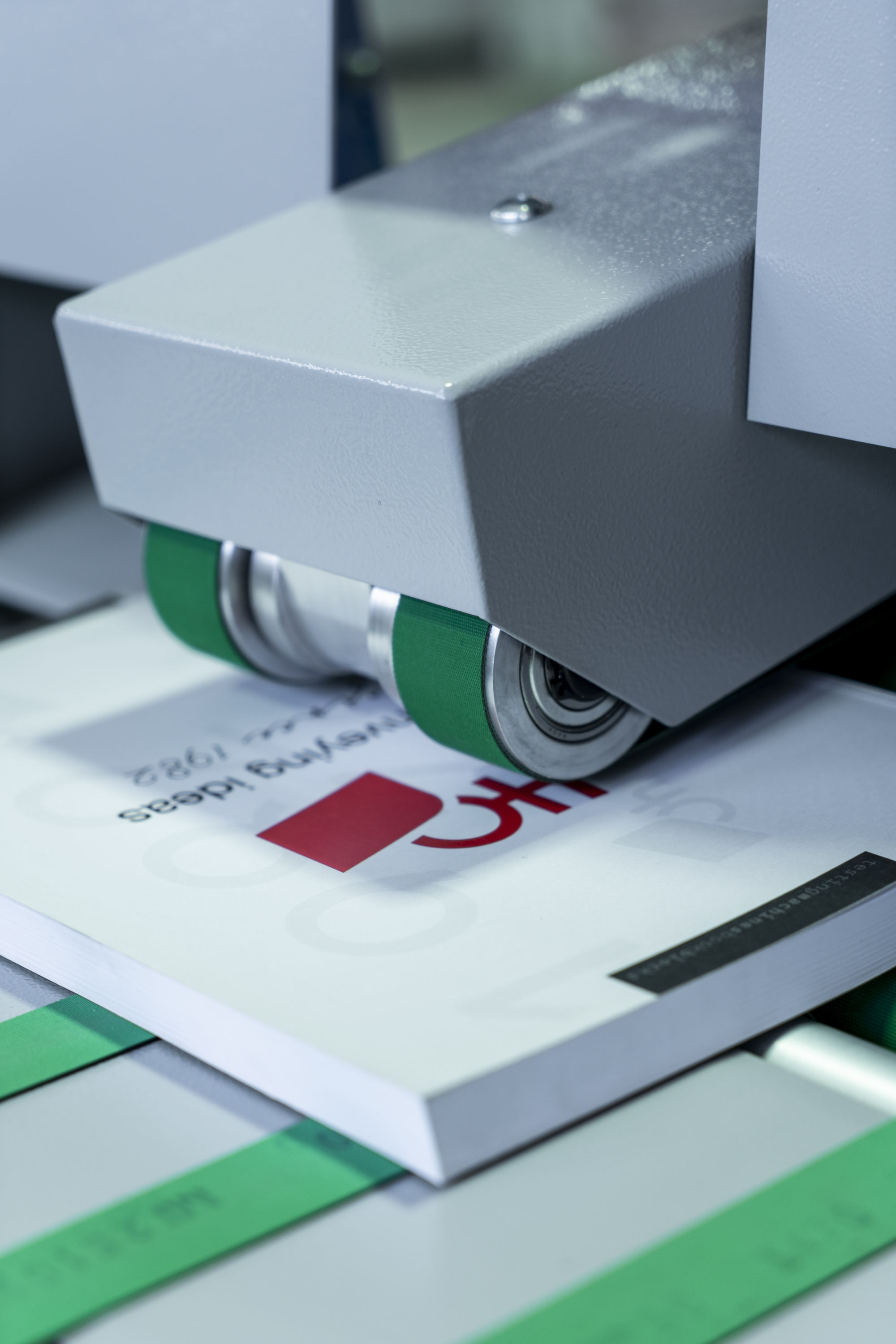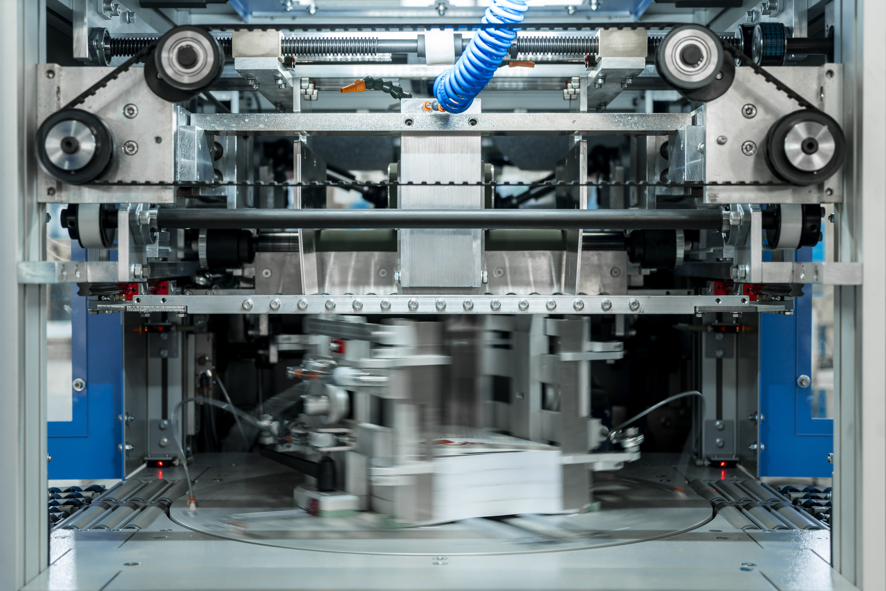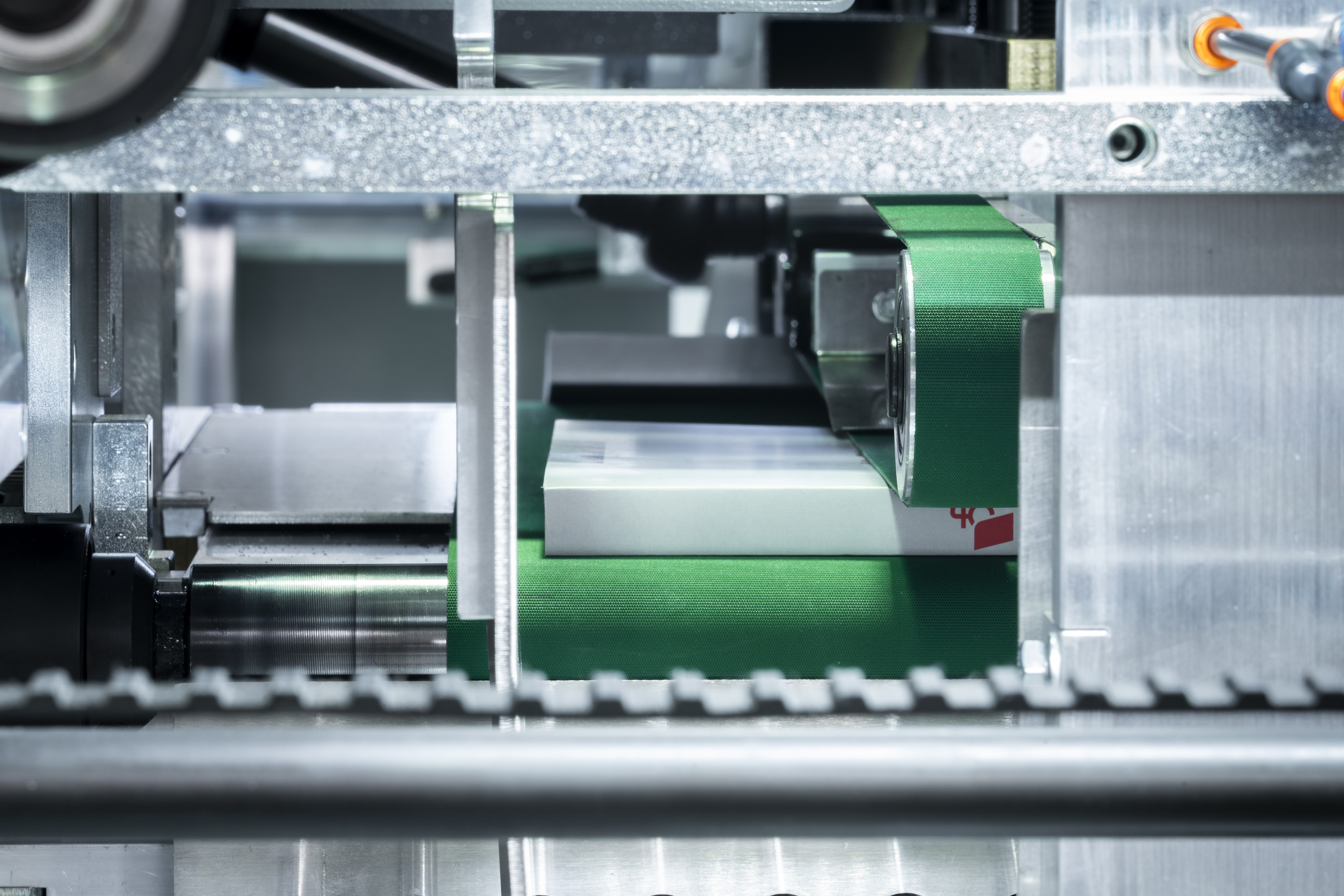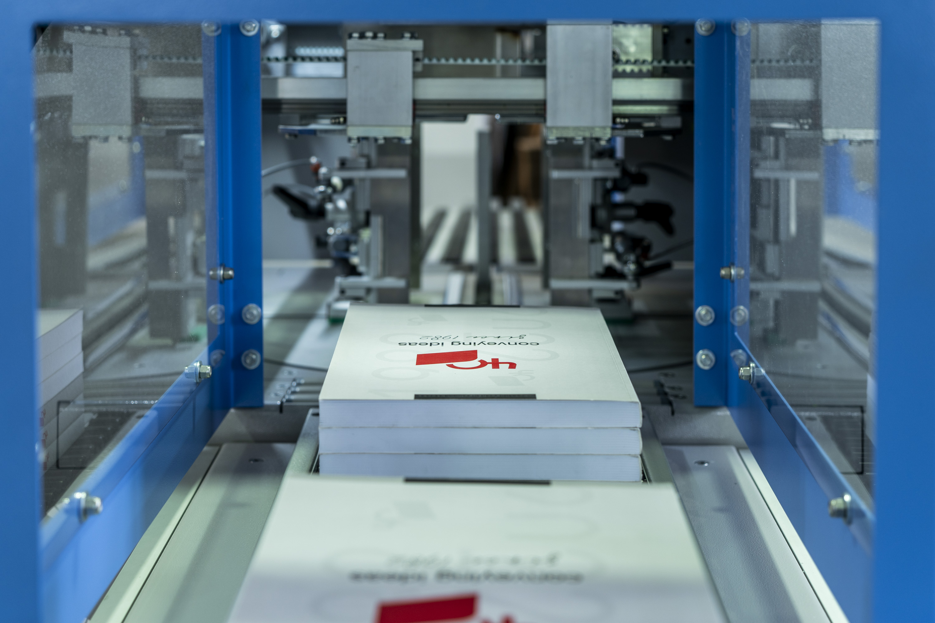 Products are then automatically transferred from the telescopic conveyor to the pre-stacking station, where final alignment takes place for orderly and stable stack formation. During this phase, the rotation station automatically orients the products according to the panel settings, compensating for book spines and achieving a more precise and stable stack. After stack formation, a pusher hook moves the stack to the next stage, ensuring perfect final alignment of the products. Depending on the production line layout, the machine can be configured with either right- or left-hand exit, providing maximum integration flexibility.