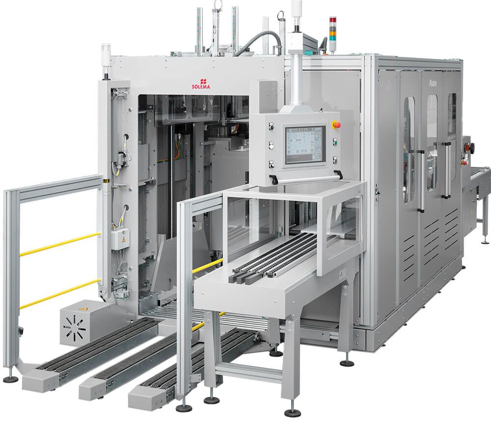The PLUTON is endowed with a timing station at the entrance, an accumulating conveyor, automatic storage for empty pallets and an automatic device for feeding of the slip-sheets.