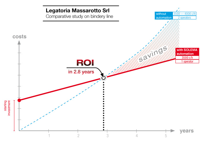 Le previsioni ROI calcolate in base al particolare tipo di produzione e alle condizioni con cui opera il cliente sono chiare. Tenuto conto dei turni lavorativi, del costo orario e della variazione in funzione dell'andamento dell'inflazione, un operatore in meno ha significato per il cliente un risparmio sui costi attorno all'80%. In meno di 3 anni l'investimento sarà interamente recuperato.