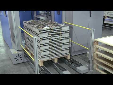 A consistent part of the production is made by short/medium runs of saddle stitched products, obtained through two stitching lines with gathering machines of 4 and 6 stations, unloaded by hand during three daily shifts. This is a heavy job for the operators, because they are supposed to load the signatures, operate the machine and follow the workflow. At the same time the finished product (which amount to more than 15000 kg per shift) have to be unloaded and palletized, with the consequent operations of inserting slip sheets and preparing the next empty pallet.