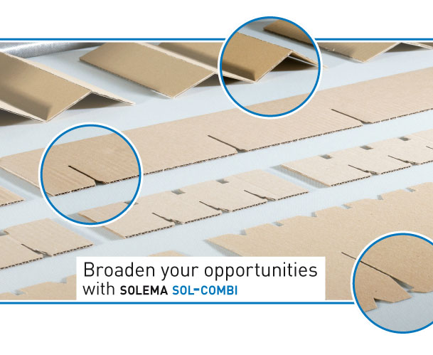 Solema sol-combi (›link) is a machine designed for accurate, high volume production of "V-lock"/"Euro-lock" partitions, pads, fitments and packing reinforcements for boxes, in corrugated and solid board.