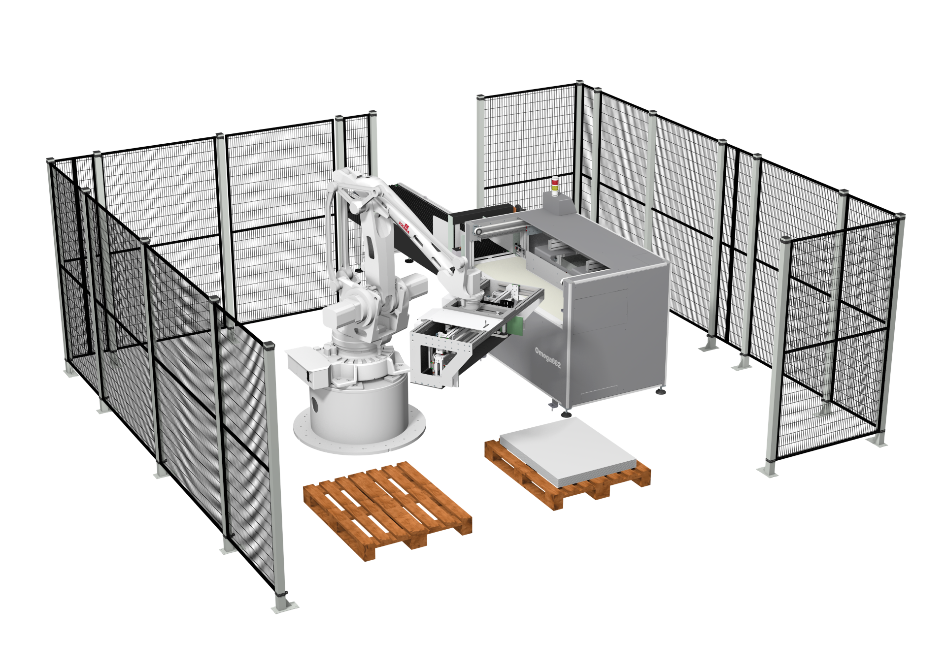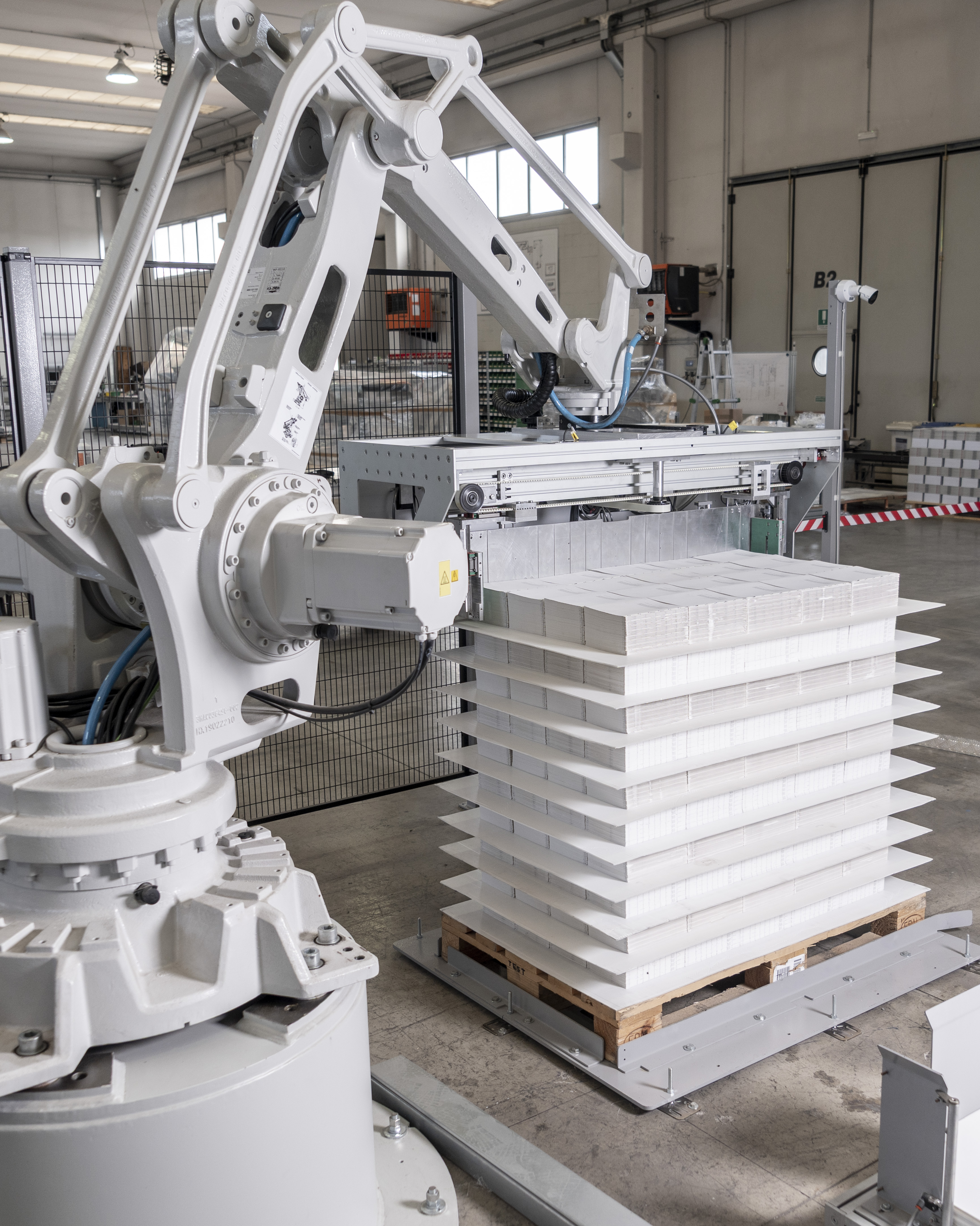 Grazie al principio di funzionamento a file, Omega682 riesce a pallettizzare i prodotti in modo compatto e stabile, avendo cura del prodotto maneggiato.