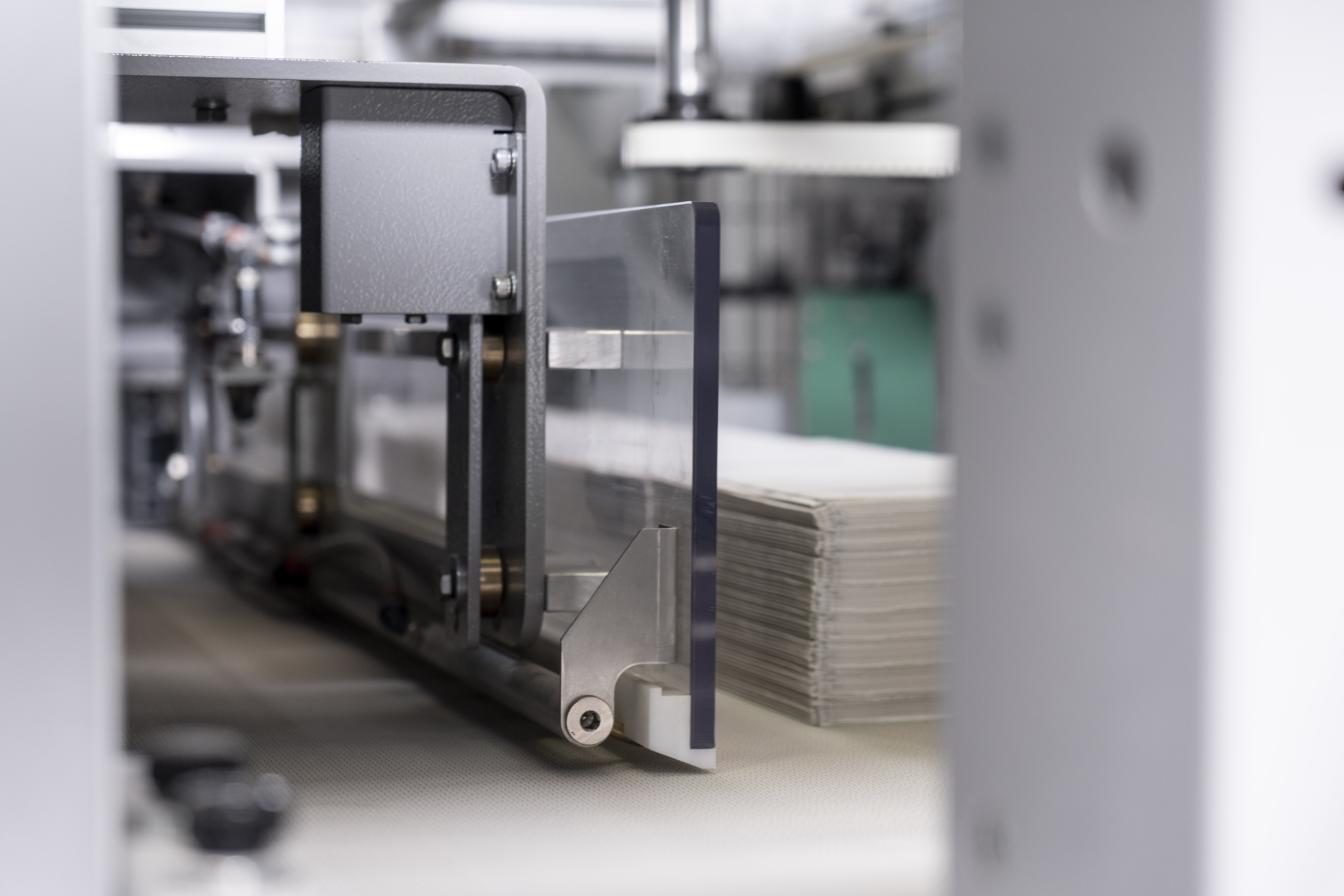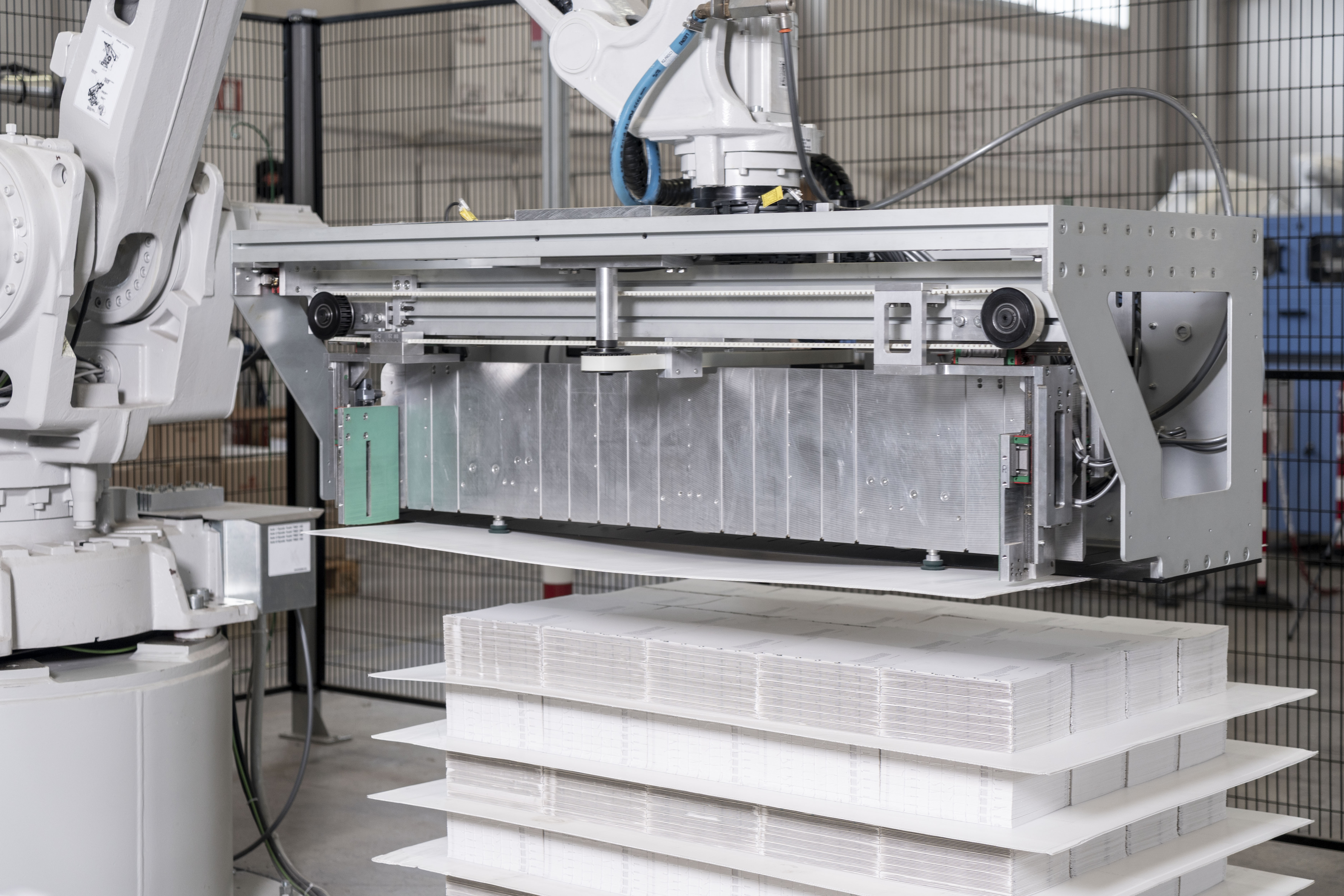 Un dispositivo di preparazione file accoda le pile di prodotti per farle scivolare nella pinza, all’interno della quale un sistema a cuscinetto d’aria minimizza contatti e sfregamenti tra i prodotti e il tool stesso. Le due pinze laterali pareggiano e sostengono le pile di prodotti così da mantenerli in posizione e adagiare il tutto correttamente sul pallet di fine linea.