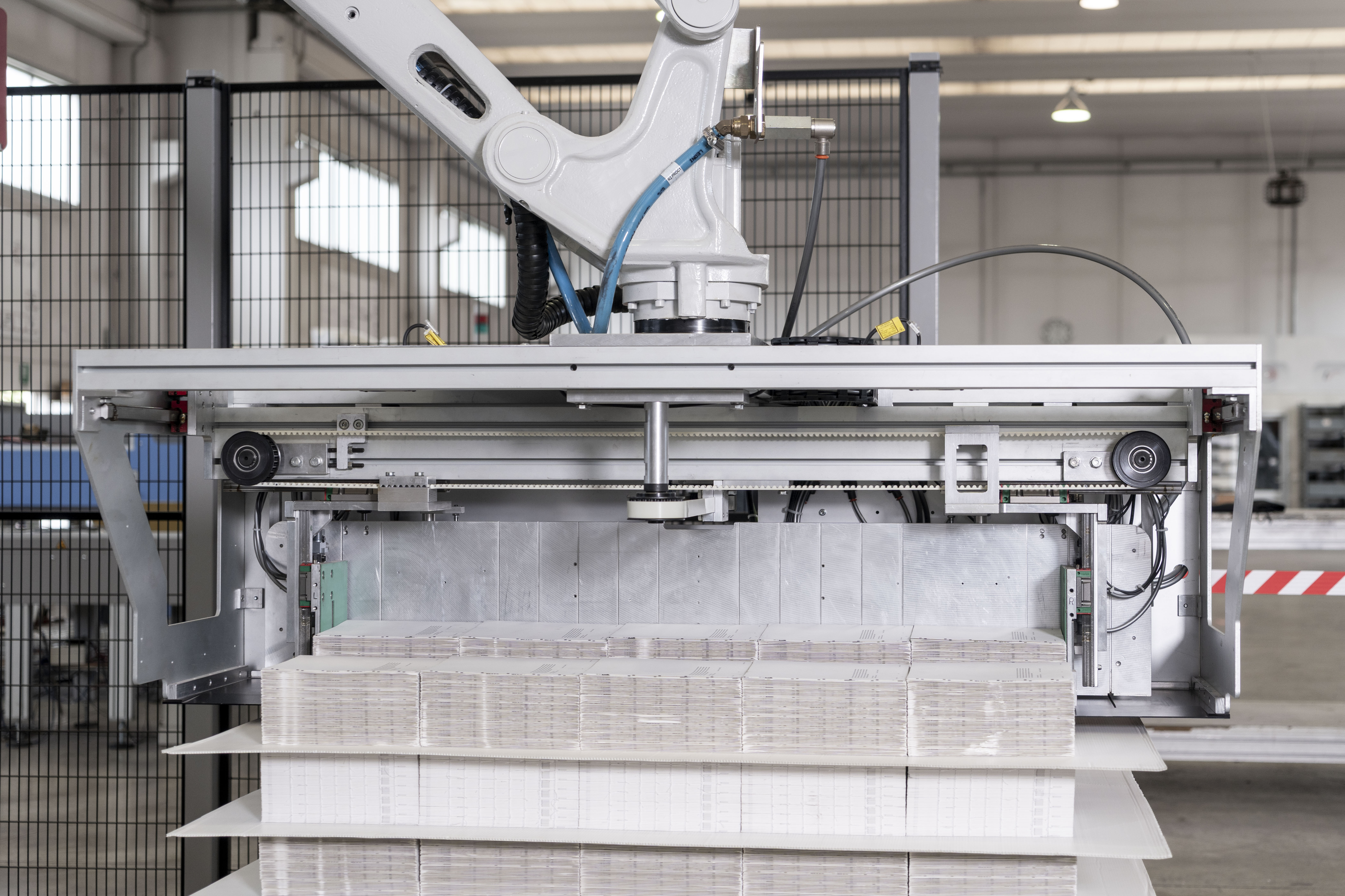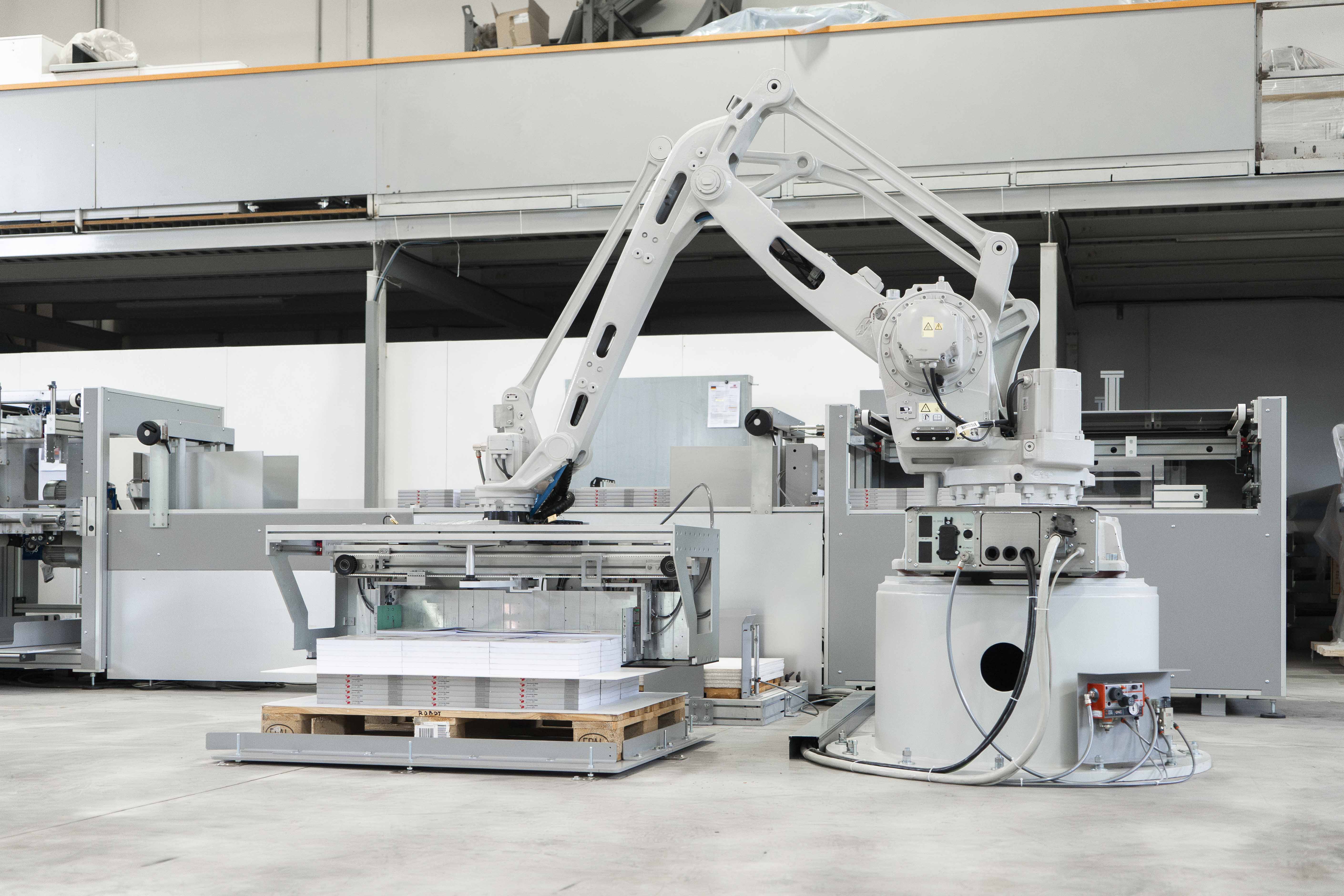 Omega682 è uno dei tool robotici di Solema per pallettizzare blocchi libro cuciti, libri brossurati o libri cartonati a fine linea ma anche scatole e fustellati stesi.